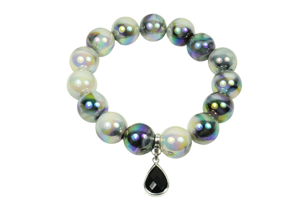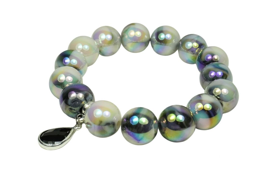Schimmernde Polymer-Perlen (Ø 14 mm) in lebhaften Farben verleihen dem Armband seinen verspielten, kreativen Charakter – perfekt für alle, die das Außergewöhnliche lieben. Als stilvoller Kontrast setzt der edle tropfenförmige Anhänger in Schwarz mit silberner Umrandung ein markantes Statement und verleiht dem Look Tiefe und Eleganz.