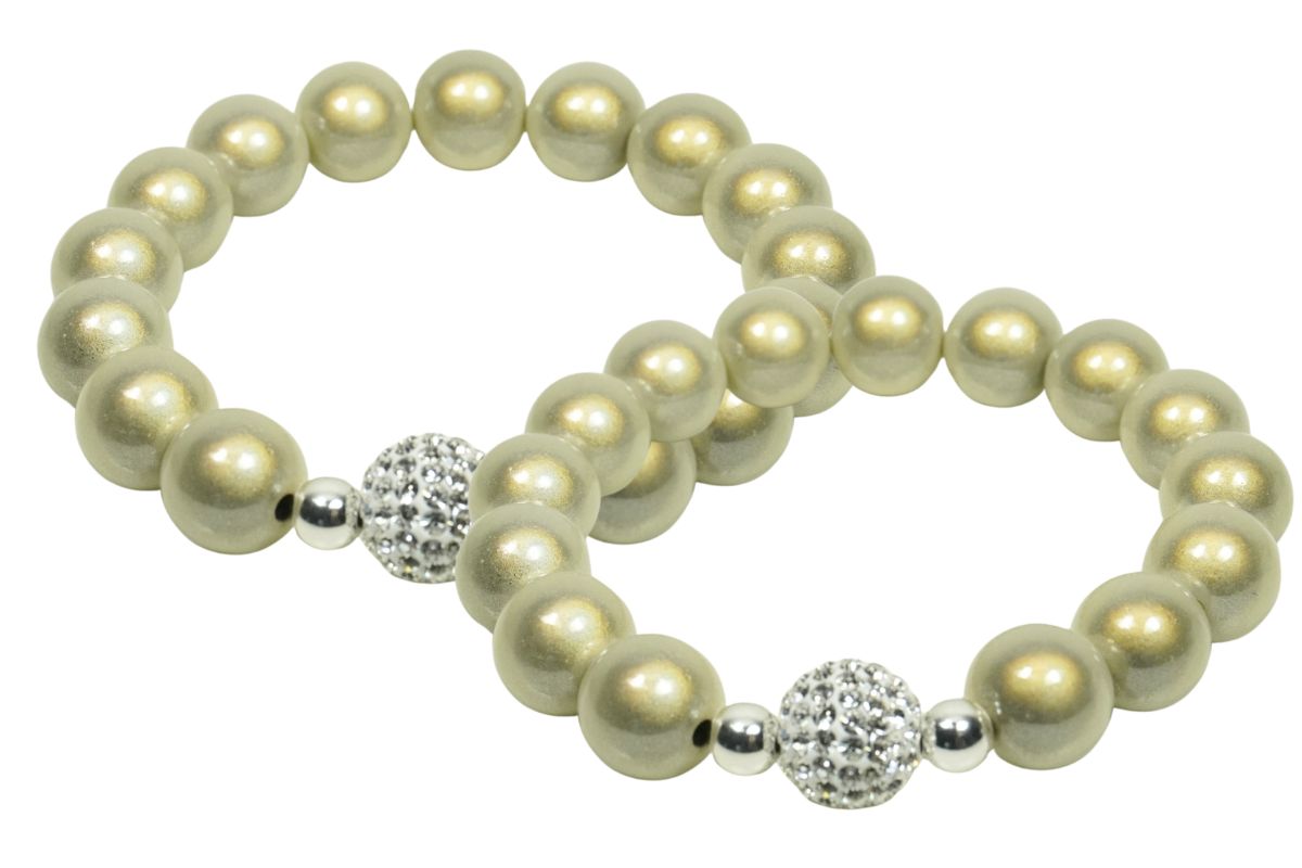 Große Polymer-Perlen (Ø 12 mm) in edlem Beige treffen auf eine funkelnde Glitzerperle, die dem Design das gewisse Etwas verleiht. Aufgezogen auf hochwertigem Jewelry Elastic Cord aus Nylon schmiegt sich das Armband angenehm an dein Handgelenk an – flexibel, bequem und langlebig.